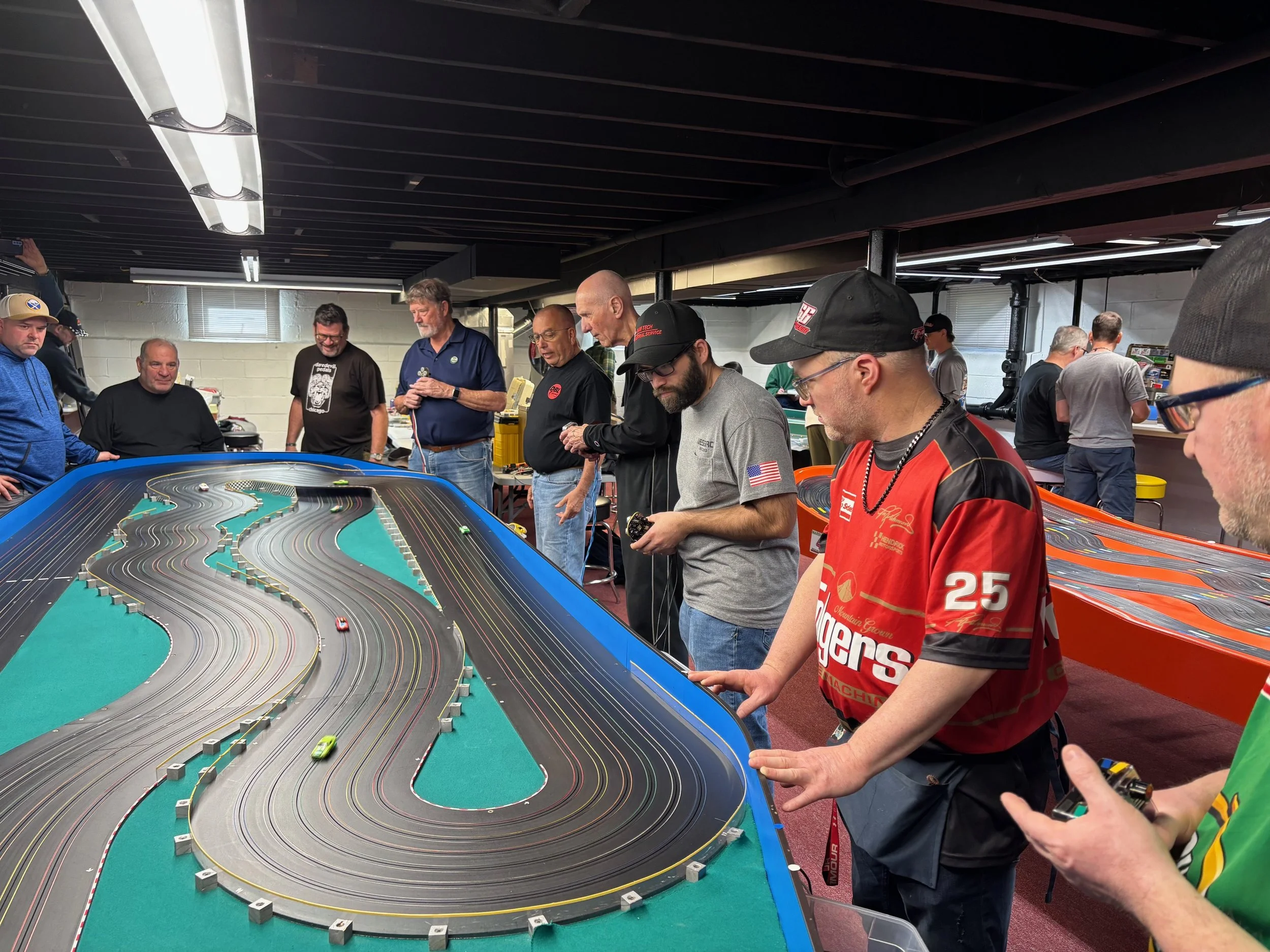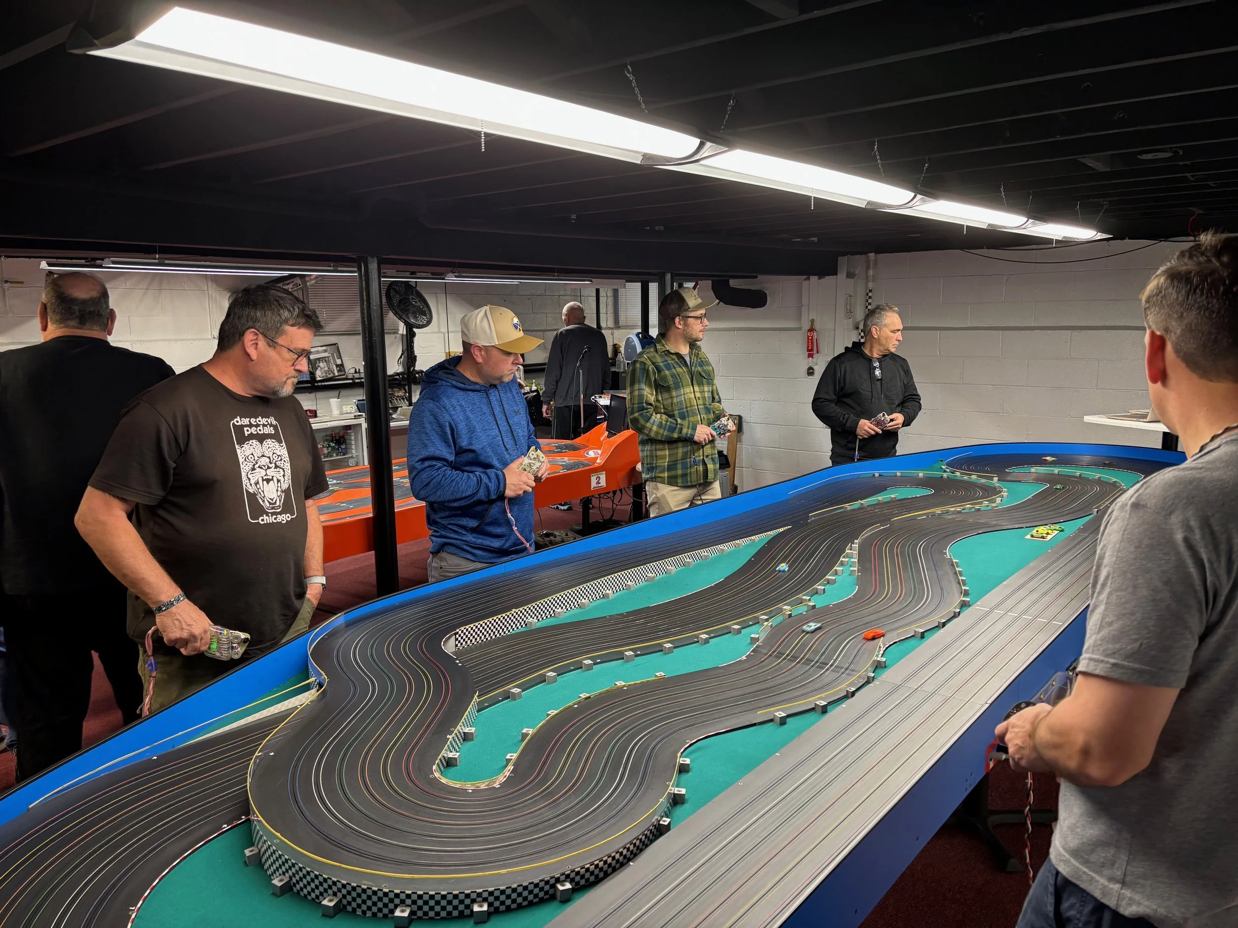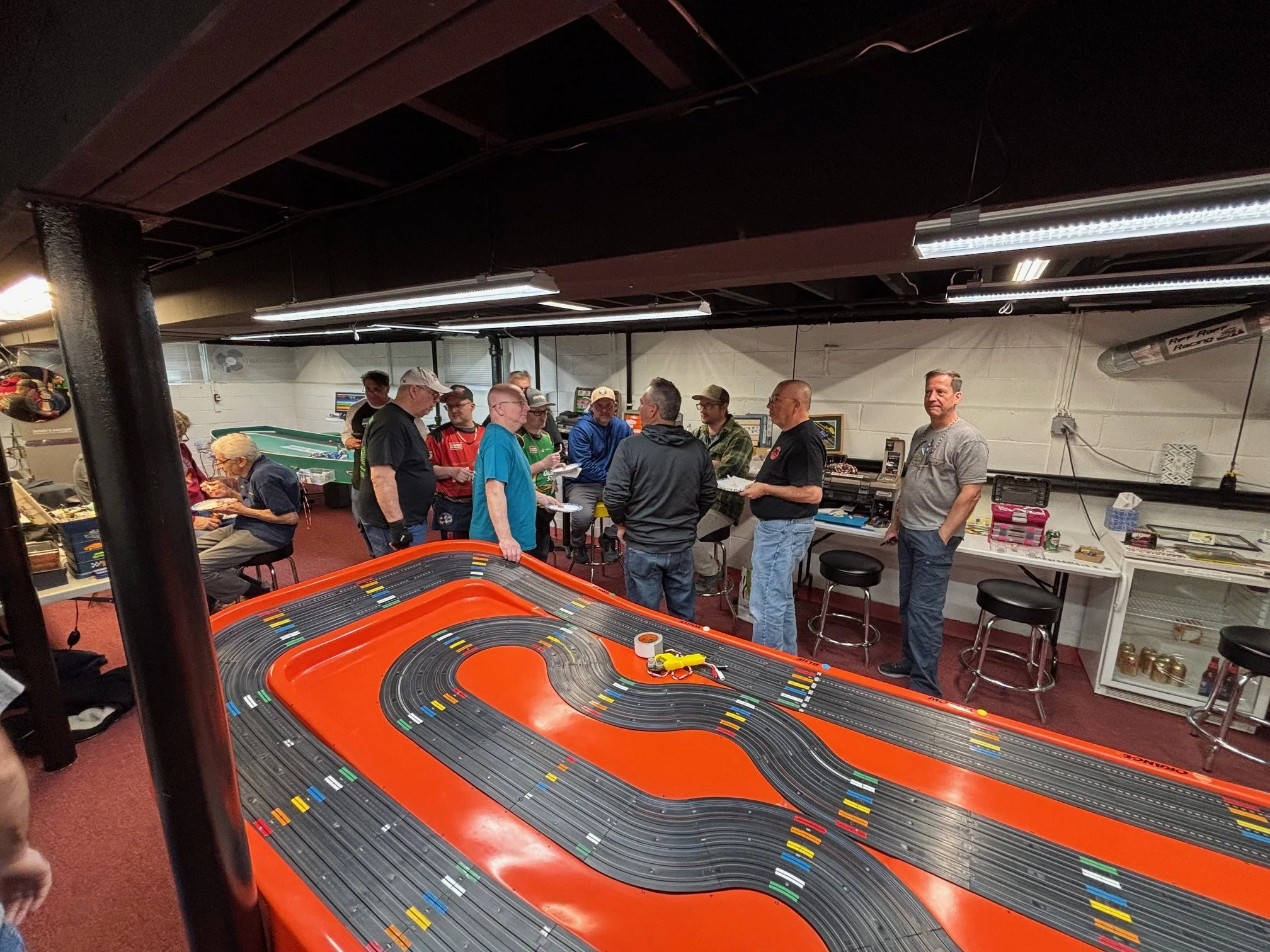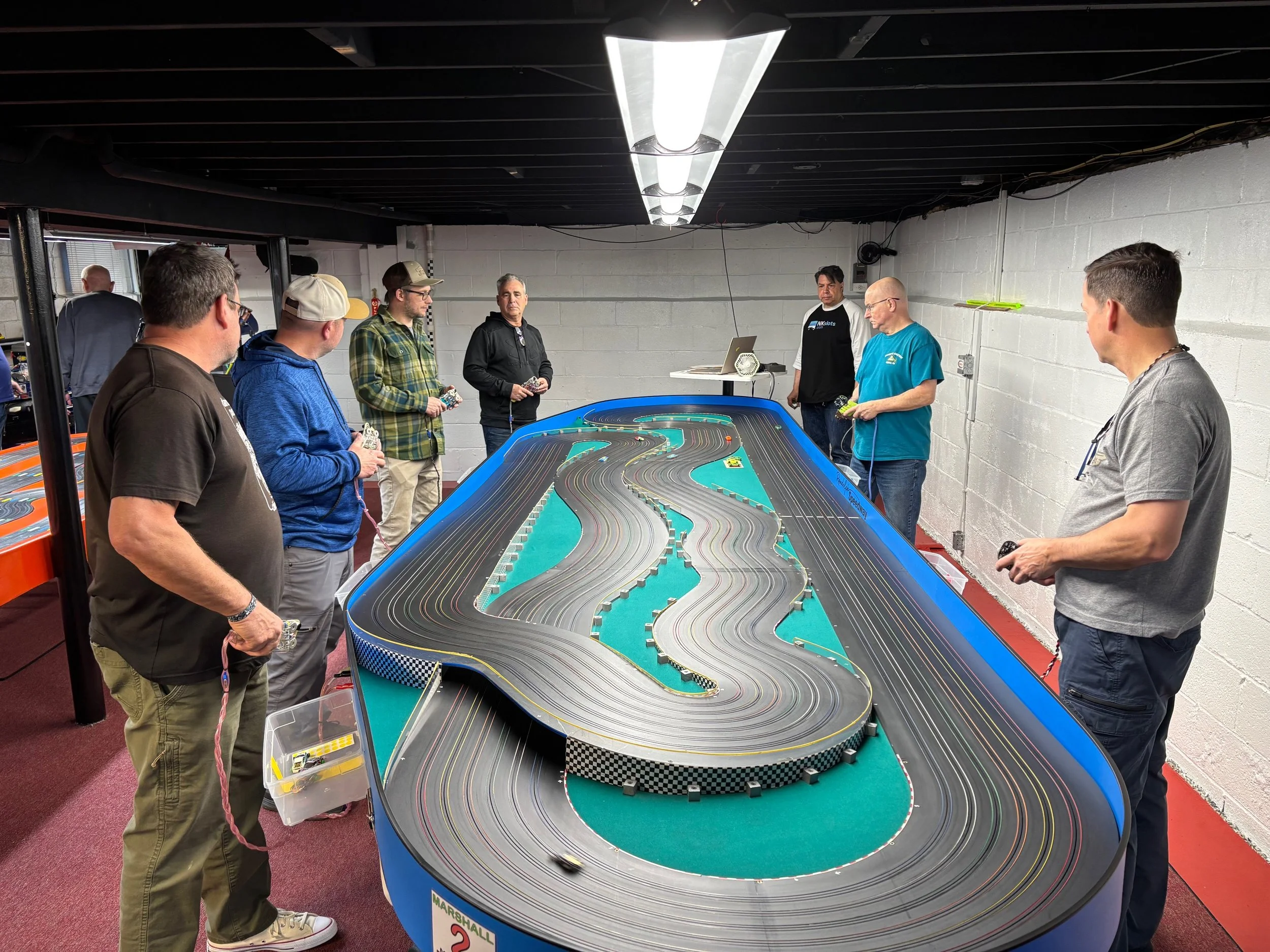 We started with the Trans-Am class, running 2-minute heats, on the bright orange tub track. There are other molded Aurora table tracks like it; Henry’s, however, has attitude. I’d go so far as to say it’s angrier than ANY other track in the northeast. The non-routed, unloved track pieces reject your car’s magnets, pickups and skinny tires. Racing on the Randolph tub is more like a rally stage than a road race. If completing a round on the tub wasn’t tough enough, marshalling the tub, immediately after you've finished 6 grueling heats, is just as difficult. De-slots here can ruin a marriage. Winning the T/a class at The Blast requires a strong roll cage; figuratively (if you catch my drift) and literally.